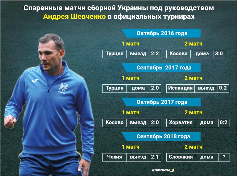 При Андрее Шевченко до сентябрьских матчей в Лиге Наций сборная Украины еще ни разу не добивалась двух побед в спаренных турах. До этого в трех случаях максимум, чего достигали «сине-желтые» - это четыре очка в «спарке» с Турцией (2:2) и Косово (3:0) в рамках отбора на ЧМ-2018.