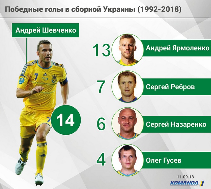 Уже сейчас доля победных голов лучшего из действующих бомбардиров Ярмоленко пока составляет 36%, а главный снайпер в истории сборной Украины Шевченко остановился на отметке в 29%.