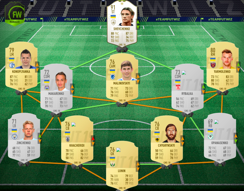 В центре поля играют Евгений Коноплянка («Шальке»), Евгений Макаренко («Андерлехт»), Руслан Малиновский («Генк»), Сергей Рыбалка («Сивасспор») и Андрей Ярмоленко (Вест Хэм»). Экс-форвард «Милана» и «Челси», а ныне наставник сборной Украины Андрей Шевченко красуется на позиции нападающего, имея самый высокий рейтинг - 91.