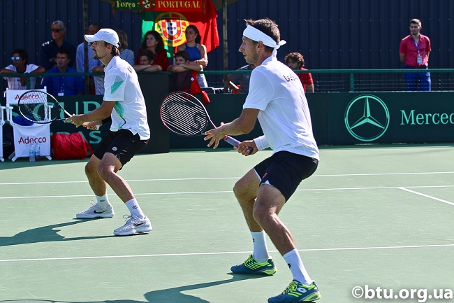 В другий ігровий день все розпочиналося майже, як в перший. Знову не одразу ввійшов до гри Жоау Соуза, лідер португальського дуету. Українці цим одразу скористалися, вигравши зі старту 4 гейми. Один брейк португальці відіграли, але сет залишився за нашими. В другій партії все змінилося. Гості стали грати більш злагоджено, а українці, навпаки, наробили купу простих помилок, особливо Денис. Тим дивнішим виглядав наш брейк за рахунку 2:2. Радість була недовгою. Тепер вже португальці взяли чотири гейми поспіль, а з ними сет. Початок третьої партії теж не віщував нічого гарного, бо суперники одразу повели 2:0. Після цього деякий час боротьба точилася лише на подачах українців, але нашим хлопцям вдалося не відпустити Еліаша з Соузою на більш, ніж два гейми. За рахунку 3:4 Денис із Сергієм не використали вже власний брейкпойнт. Але у вирішальний момент на матч португальці подати не змогли: за шаленої підтримки трибун наші зрівняли рахунок. Нарешті, в кінці гри почали грати на слабку португальську ланку - Еліаша. Справа дійшла до тайбрейку, де з кожних двох подач одна неодмінно закінчувалася міні-брейком. У нас з’явився перший матчбол, який реалізував Сергій Стаховський блискучим ейсом. Так збірна України вийшла вперед 2:1.