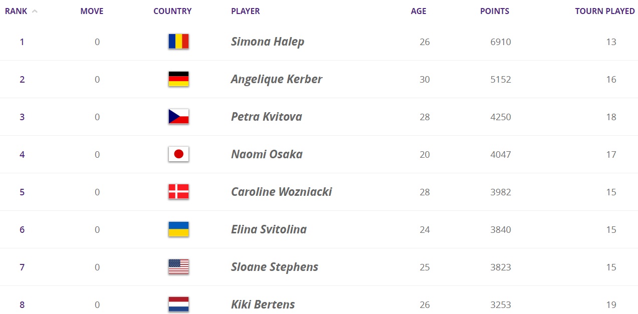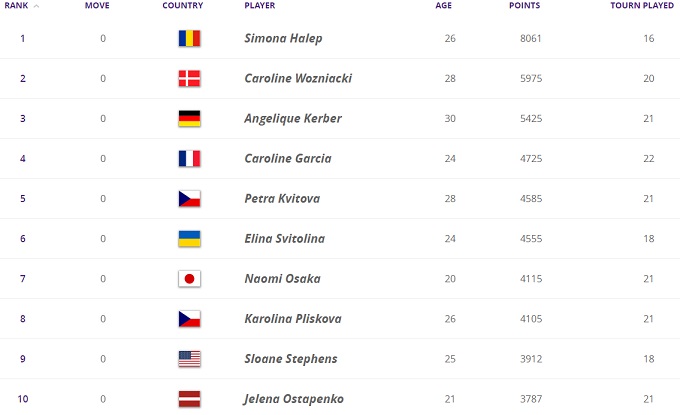 В Чемпионской гонке также без изменений. Халеп и Кербер уже классифицировались в Сингапур, остальным придется побороться в концовке сезона.