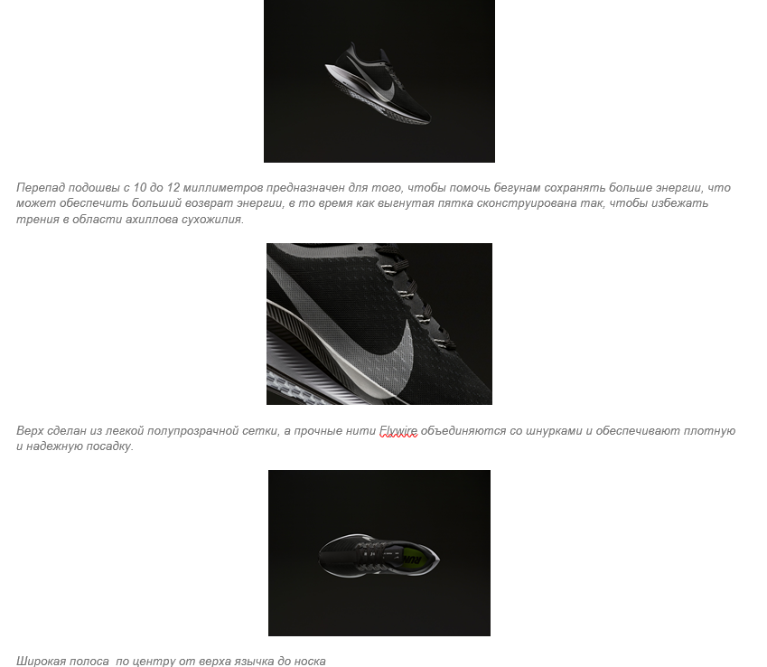 В отличии от Zoom Vaporfly Elite и Zoom Vaporfly 4% (которые, в большей степени, рассчитаны на профессиональных атлетов) в модели Zoom Pegasus Turbo не используется вставка из углеродного волокна. Это позволило снизить жесткость и обеспечить комфортное соприкосновение с землей, которое так необходимо при ежедневных тренировках.