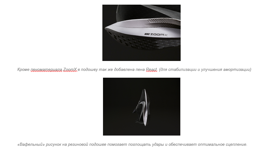 Дизайнеры Nike, используя закон сохранения энергии («Энергия может превращаться из одной формы в другую и перераспределяться между частями системы»), создали пеноматериал, способный уменьшить количество энергии, теряемой обувью во время бега. В отличие от аналогов, подошва ZoomX возвращается к первоначальной форме максимально быстро, когда стопа отрывается от земли. За счет быстроты восстановления подошвы и происходит максимальный возврат энергии.