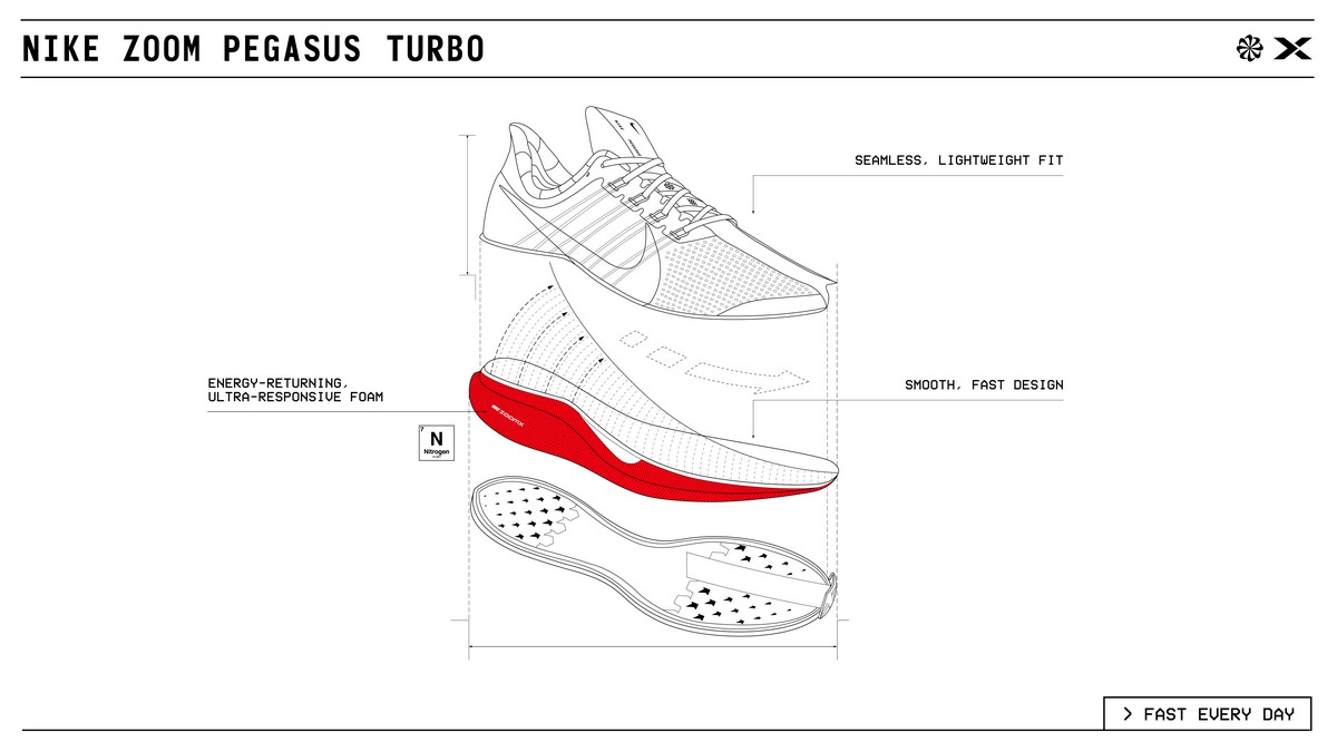 Вдохновленные лучшими кроссовками для марафона Zoom Vaporfly Elite и Zoom Vaporfly 4%, Nike Zoom Pegasus Turbo получили большее ускорение за счет обтекаемой формы и пеноматериала c высокими амортизационными свойствами — ZoomX, который обеспечивает 85% возврата энергии. Это максимальный показатель по сравнению с другими пеноматериалами Nike. Благодаря инновационной подошве, модель также стала самой легкой в беговой линейке бренда.