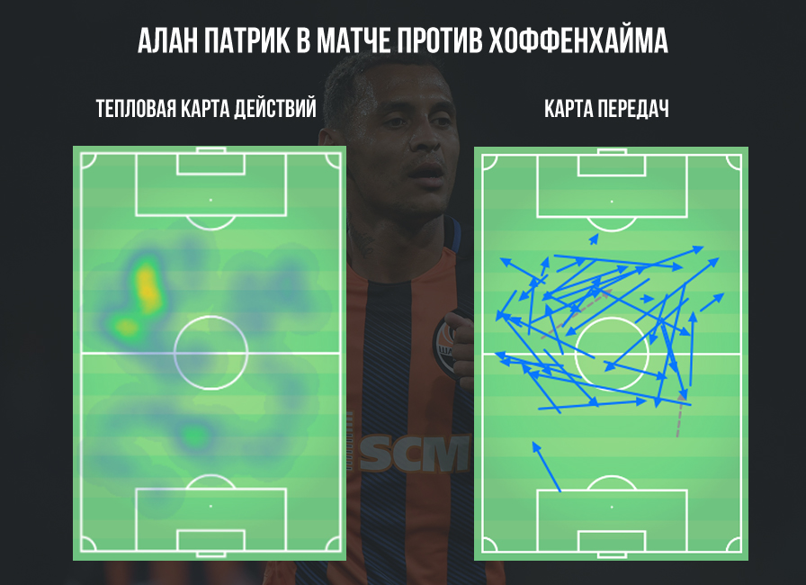 Но наибольшим разочарованием стала игра Алана Патрика. Бразилец, которому уже 27 лет, стал наиболее уязвимой фигурой на шахматной доске Паулу Фонсеки для его оппонента. Можно сказать, что Патрик был просто съеден агрессивными и быстрыми действиями футболистов «Хоффенхайма». Бразилец выиграл лишь 4 единоборства из 12-ти, не отличившись ни удачными обводками, ни успешными навесами или длинными передачами. Да, Алан Патрик «насобирал» в свой актив 40 выполненных передач при 95%-ной точности. Однако достаточно глянуть на карту этих пасов, чтобы понять - это были действия ради действий. Бразилец не выполнил ни одной передачи в штрафную и не смог отличиться ни единым обостряющим пасом в разрез.