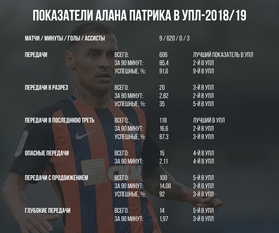 Столь же успешен Патрик и по числу передач в разрез, опасных передач, пасов с продвижением и глубоких передач. Во всех этих компонентах Алан Патрик неизменно находится в пятерке лучших в УПЛ, причем как по количественной составляющей, так и по качественной, что немаловажно!