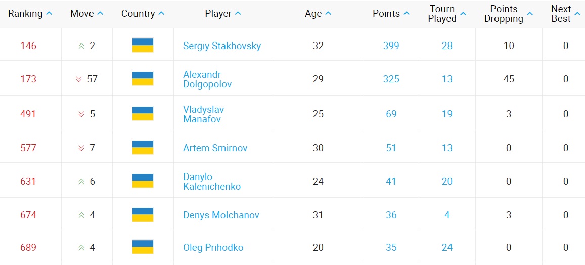 Что касается украинцев, то ситуация плачевная. Играет у нас на более-менее высоком только Сергей Стаховский. Александр Долгополов пропускает большую половину сезона из-за травмы и падает все ниже и ниже, Илья Марченко без побед и вовсе вылетел из первой тысячи.