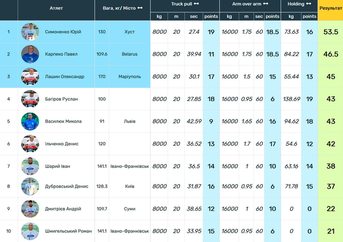 А от його земляк – призер турніру «Силище Айсман» Павло Карпеко «натримав» на «срібло»! Павлові вдалося випередити у загальному заліку іменитого Олександра Лашина. Сашко дещо невдало вибрав позицію для виконання вправи, ускладнивши собі роботу. Відтак не протримав авто достатньо довго для збереження другого місця. Однак «бронза» у першому після паузи індивідуальному турнірі красномовно свідчить, що пороху у порохівницях ще вдосталь, а досвідченому стронгмену варто поміркувати чи не повернутися б у спорт з нового сезону!