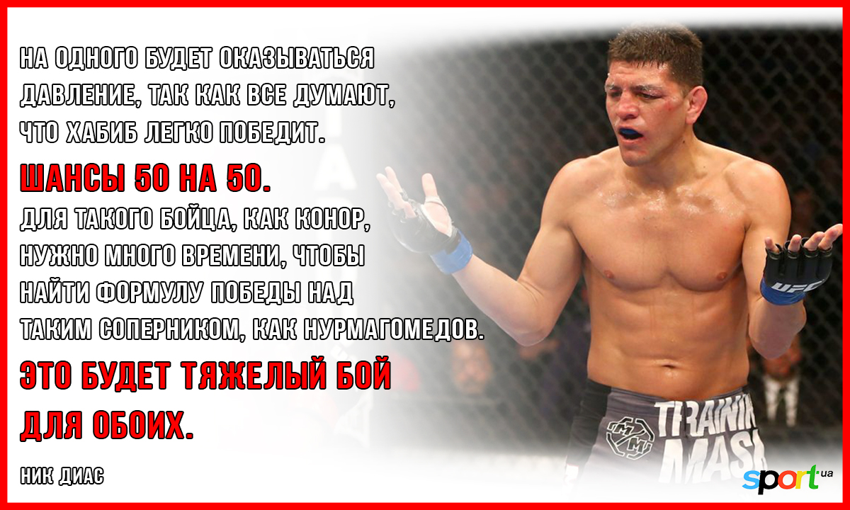 «Я думаю, что победит Конор. Не забывайте, что бой всегда начинается на ногах. У Конора отличный тайминг, он пробивает точные комбинации, очень умно работает в стойке. И в отличие от многих, я не согласен, что Конора легко перевести в партер. Да, Хабибу это под силу, но наверняка тренерский штаб МакГрегора проведет здесь работу.