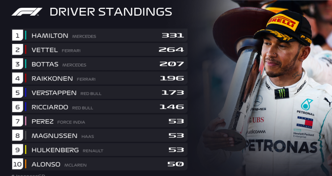 +35, +50, а теперь уже +67 в общем зачете в пользу Льюиса Хэмилтона. Если через две недели в США Феттель при победе Хэмилтона приедет третьим и ниже, то британец досрочно станет чемпионом мира. Кто бы мог подумать, что сезон, где прогнозировалась борьба буквально до последнего этапа, может решиться за три гонки до конца.