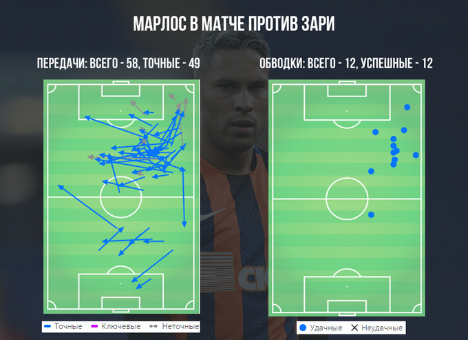 Марлос за поединок выполнил 12 попыток обводок, причем все завершил в свою пользу, но ни одна из них не произошла в штрафной соперника и лишь три были невдалеке от этой зоны. Подобная картина и с передачами - их на счету хавбека «Шахтера» 58, из которых 49 были точными, но если взглянуть на карту пасов Марлоса, то станет понятно - перед ним часто возникала стена из защитников соперника, не позволяющая делать острые передачи в штрафную «Зари».