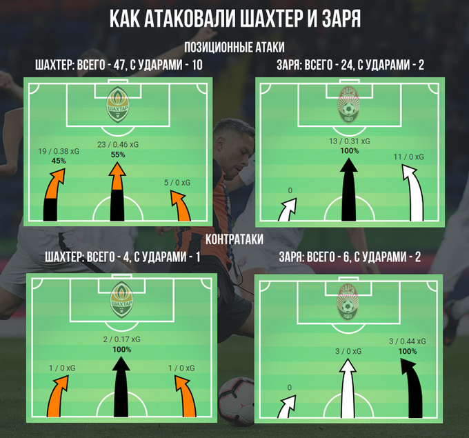 Очевидно, что через левый фланг атакующих действий у «Шахтера» проходило практически столько же, сколько и через центр. А вот справа активность была гораздо менее значительной, о главной причине чего мы уже поговорили в аспекте действий футболистов «Зари» против Марлоса.