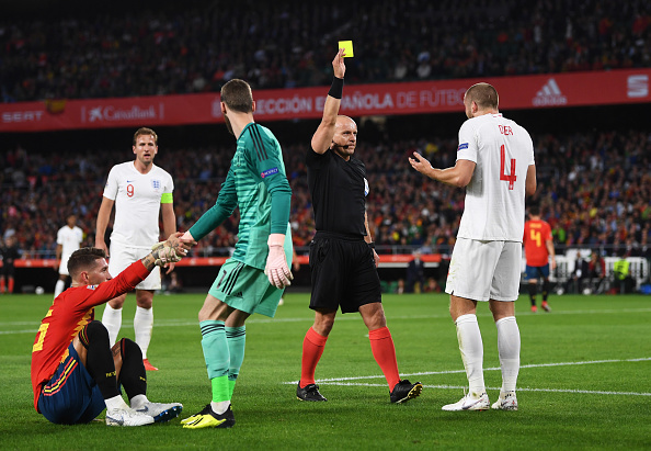 12 мин. Дайер получил предупреждение за грубый подкат против Рамоса в штрафной испанцев.