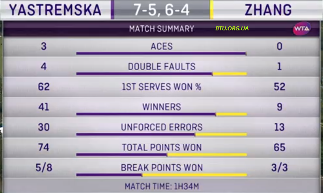 У своїй четвертій грі на турнірі Даяна зустрілася з другою ракеткою Китаю, №40 WTA Шуай Чжан. Це вже зовсім інший рівень опозиції. Тому за стабільність Ястремської перед матчем були серйозні побоювання. Недарма. Непогано почавши гру, захопивши лідерство 2:1 з брейком, знов почалася злива невимушених, що призвела до чергових 2:5. Тут вкотре вдалося заспокоїтися та почати влучати. 5 геймів поспіль – 7:5 у сеті. Але Чжан – досвідчений боєць. Зі старту другої партії вона змогла підтиснути Ястремську та повести 3:0. Даяна у відповідь взяла допомогу залу, тобто свого тренера, Олів’є Женома. Той зумів заспокоїти українку та донести до неї необхідність правильної роботи ніг при підході до м’ячу. Знову взяла п’ять геймів поспіль і спокійно довела гру до перемоги. 7:5, 6:4 – щастю Даяни не було меж!