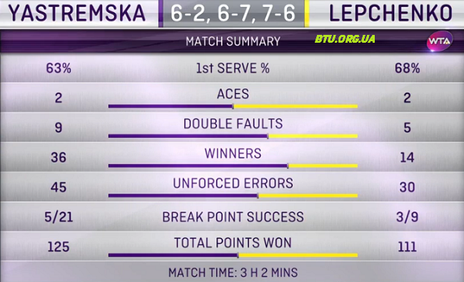 Во второй партии все было ровнее. Варвара повела 3:1, но Даяна быстро восстановила статус-кво. Со счета 3:3 теннисистки брали только свои подачи и перевели сет на тай-брейк. Стоит отметить, что в 12-м гейме Ястремская имела три матчбола на подаче соперницы, но реализовать их не смогла. На тай-брейке второго сета украинка заработала тройной матчбол, но и его не реализовала. Лепченко также играла нестабильно и смогла забрать сет только с пятого сетбола.
