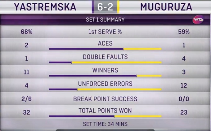 С самого начала поединка Ястремская играла так легко, словно не было турнира в Гонконге, 15-часового перелета после финала и вчерашнего трехчасового марафона против Лепченко. В первом сете Даяна уничтожала неповоротливую Мугурусу на своих подачах (было отдано всего 2 розыгрыша за сет) и постоянно имела шансы на подаче испанки. Гарбинье, конечно же, сегодня играла далеко не в лучший свой теннис, но это уже ее проблемы. Данный расклад сил рано или поздно должен был вылиться в брейки, которые и последовали после счета 2:2. До конца партии Ястремская забрала все геймы и со старта второго сета повела 2:0. Это, на секундочку, шесть выигранных геймов подряд. Невероятное достижение.