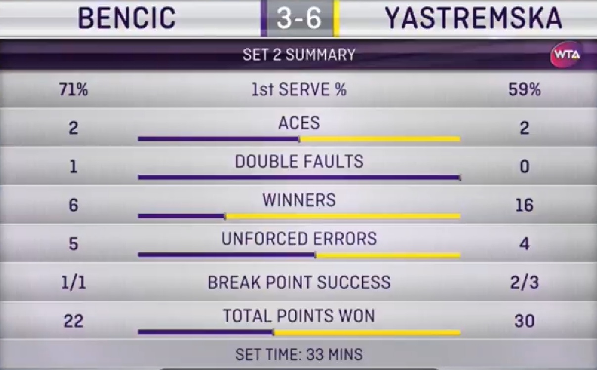 На первый сет Даяна вышла без надлежащей концентрации, особенно это было заметно на фоне соперницы. Бенчич играла практически безошибочно (2 невынужденные за сет), хотя и особо не обостряла. А вот у Ястремской не получалось хорошо побороться за важные мячи в концовках нескольких первых геймов. Часто она в выигрышных ситуациях плохо играла у сетки, чего за ней не замечалось на протяжении этих фантастических двух недель. Это привело к тому, что представительница Швейцарии повела с двумя брейками и украинка дальше практически не сопротивлялась, хотя и отыграла сетбол на своей подаче в седьмом гейме.