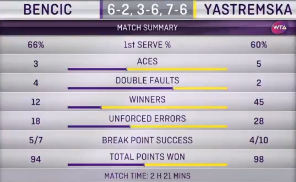 Даяна Ястремская (Украина) – Белинда Бенчич (Швейцария) – 2:6, 6:3, 6:7(5)