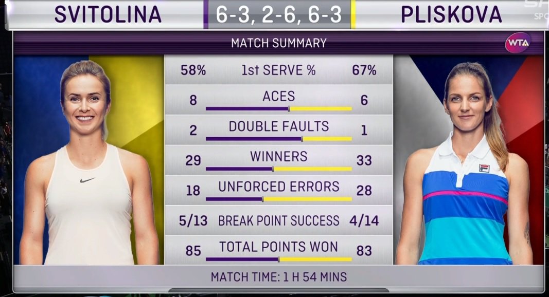 Развязка матча наступила спустя несколько мгновений. Сначала Плишкова отбилась от двойного матчбола, но с третьего раза Свитолина все же закончила поединок победой.