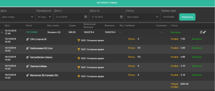 Также нет проблем ни с уникальными коэффициентами, ни с выводом крупных сумм. Вот, пример то ли «грамотной игры» хоккейного эксперта, то ли счастливого случая или комбинации этих факторов. В любом случае, выплата (обратите внимание на общий коэффициент ‒ 2084,56!) была осуществлена оперативно и в полном объеме.