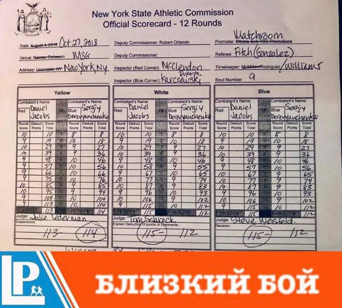 Один из судей отдал победу Деревянченко со счетом 114:113, двое других посчитали, что сильнее был Джейкобс — 115:112 и 115:112.