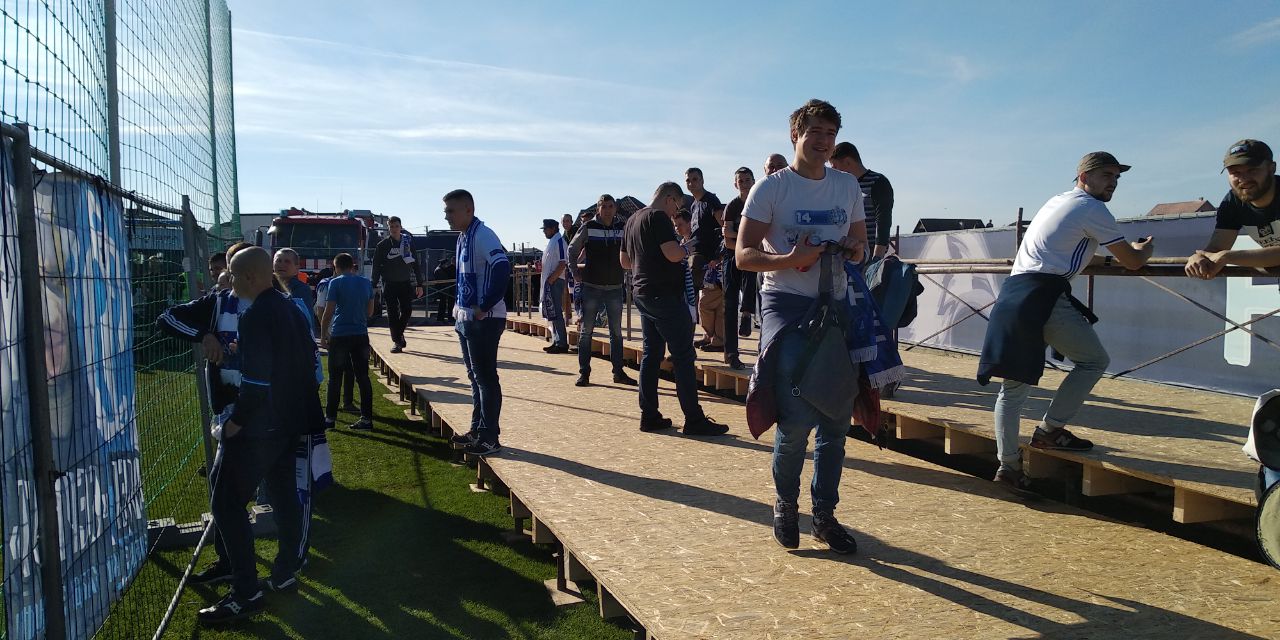 Для болельщиков гостей принимающая сторона соорудила временную трибуну за воротами. К слову, фанов «Динамо» от гостеприимных хозяев ждал на трибуне приятный сюрприз – пиво и бургеры.