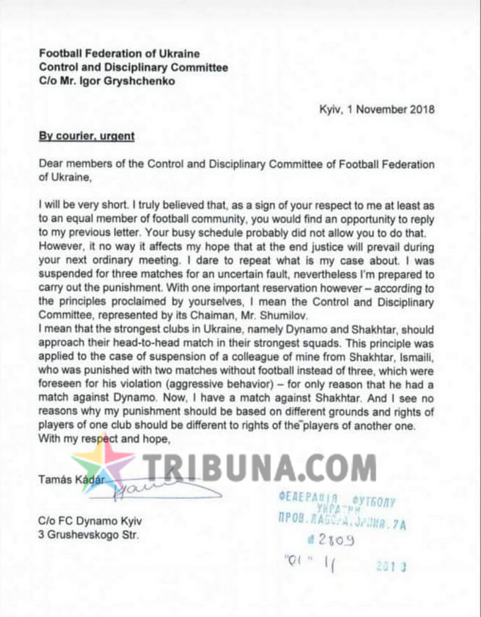 28-летний венгерский защитник киевского «Динамо» Тамаш Кадар написал письмо в КДК ФФУ, где он просит уменьшить его дисквалификацию и позволить сыграть матч против «Шахтера».