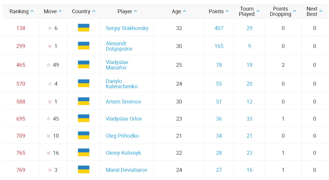 Что касается украинцев, то Сергей Стаховский поднялся на 6 позиций, Владислав Манафов совершил рывок на 49 строчек, а Владислав Орлов устуновый новый персональный рекорд.