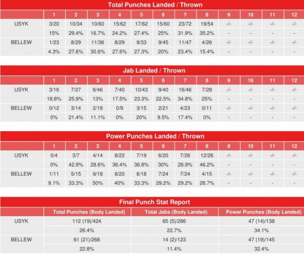 Таковы данные системы Compubox, опубликовавшей полную статистику ударов. Примечательно, что по количеству завершенных ударов Усик проиграл Беллью только один раунд — третий. В целом, Александр выбросил почти в два раза больше ударов, чем его оппонент, и в два раза был точнее своего противника.