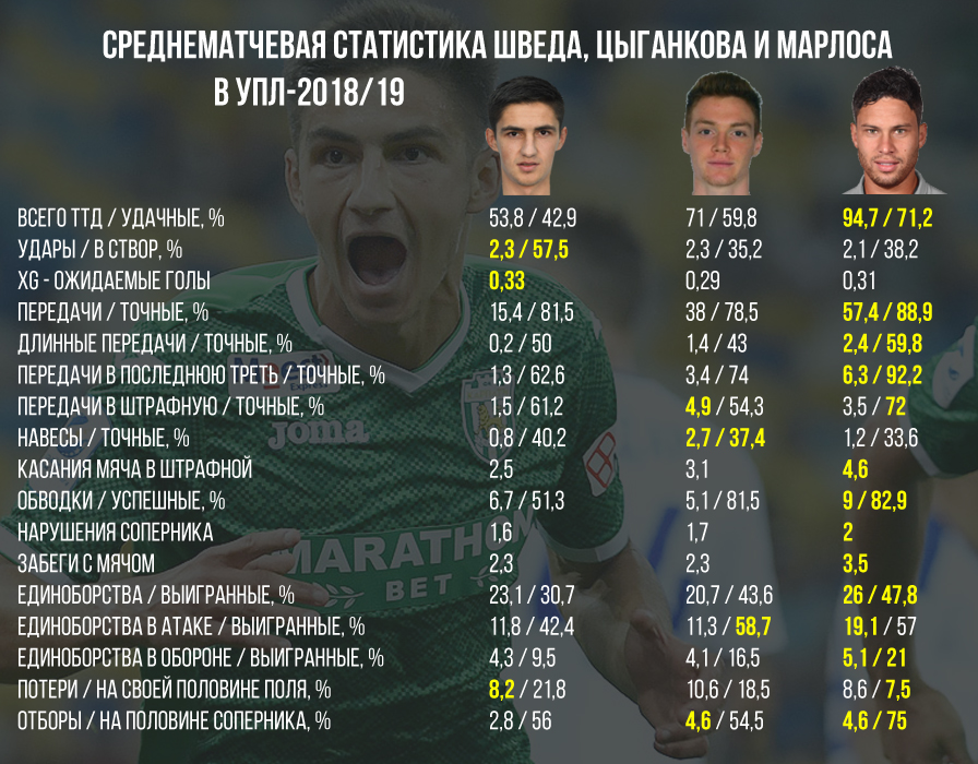 Сильные и слабые стороны: Швед в силу своего возраста все еще остается крайне нестабильным игроком. Однако в нынешнем сезоне Марьян показывает очень хорошую нацеленность на ворота соперников, что делает его убийственным оружием в составе «Карпат». Чтобы лучше понимать сильные и слабые стороны Шведа, сравним его игровые показатели в текущем розыгрыше УПЛ с аналогичными данными Виктора Цыганкова и Марлоса. Пускай последний и не был вызван, но в принципе остается «на подхвате» и не пропустит так много, как Ярмоленко, который в нынешнем сезоне, быть может, сборной уже не поможет.