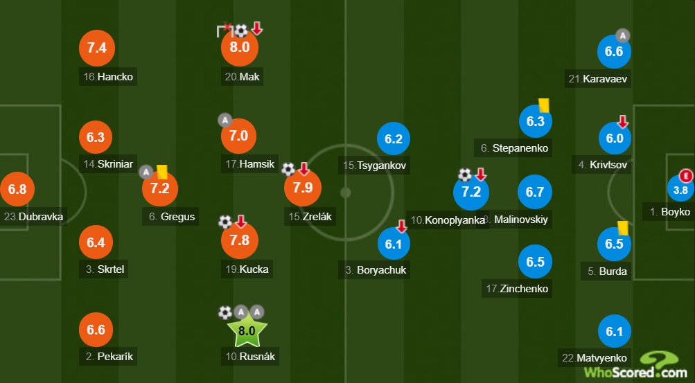 Лучшим игроком в составе нашей команды стал Евгений Коноплянка (7,2). Лучшие в составе Словакии – Роберт Мак и Альберт Руснак (8,0).