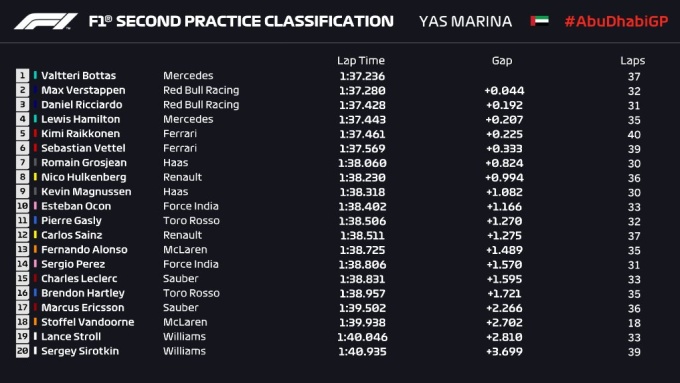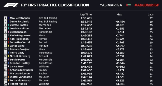 В первой практике Гран-при Абу-Даби быстрейшим был Макс Ферстаппен. Пилот Ред Булла опередил напарника Даниэля Риккардо на внушительные 0,4 секунды.