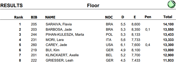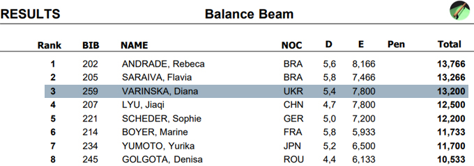 На бревне у женщин первые два места заняли девушки из Бразилии: Ребека Андраде и Флавия Сараива, бронза у Дианы Варинской. В финале у Дианы была серьезная ошибка после акробатической связки, но остальная часть упражнения была выполнена без особых помарок, в итоге она смогла удержаться на третьем месте: