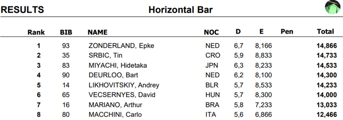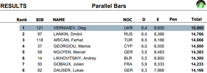 В очередной раз подтвердил свой высокий класс на параллельных брусьях Олег Верняев. Несмотря на травмы он смог выграть еще одно золото в этом виде. За свою комбинацию он получил ровно 15 баллов при базе 6.4: