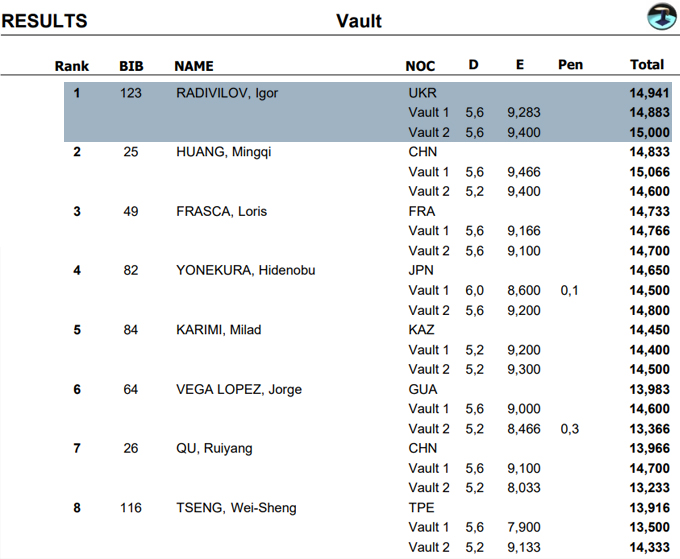 На опорном прыжке Игорь отлично исполнил оба прыжка и со средней оценкой в 14,941 и обошел всех соперников. В итоге очередное золото для Игоря в этом виде: