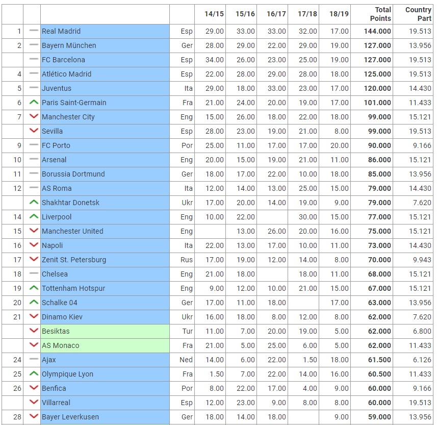 Идущая двенадцатой итальянская «Рома» (79), которая получила свои 4 балла за выход в плей-офф, опережает «горняков» лишь по дополнительному показателю (баллы, набранные в текущем сезоне). На 14-м месте опасным конкурентом выглядит «Ливерпуль» (77).