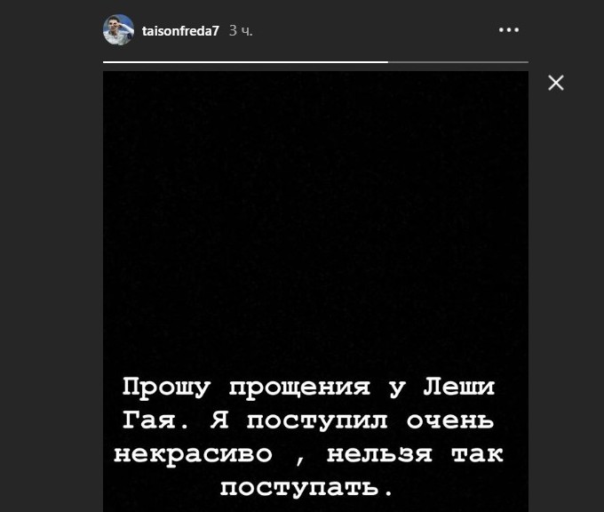 «Прошу прощения у Леши Гая. Я поступил очень некрасиво, нельзя так поступать», — написал Тайсон в Instagram после матча.