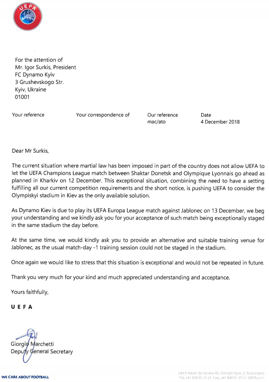 «Нынешняя ситуация, когда было введено военное положение в части страны, не позволяет УЕФА разрешить проведение матча Лиги чемпионов УЕФА между командами «Шахтер» (Донецк) и «Олимпик» (Лион), как планировалось в Харькове, 12 декабря. Эта исключительная ситуация, в сочетании с необходимостью иметь подготовку стадиона, соответствующую нашим действующим требованиям и коротким временем, оставшимся перед матчем, заставляет УЕФА рассматривать Олимпийский стадион в Киеве, как единственное имеющееся в наличии решение.
