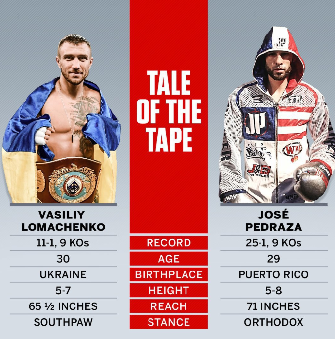 В ночь с 8-го на 9-е декабря в Нью-Йорке чемпион мира в легком весе по версии WBA украинец Василий Ломаченко (11-1, 9 KO) встретится с чемпионом мира по версии WBO Хосе Педрасой (25-1,12 KO) из Пуэрто-Рико.