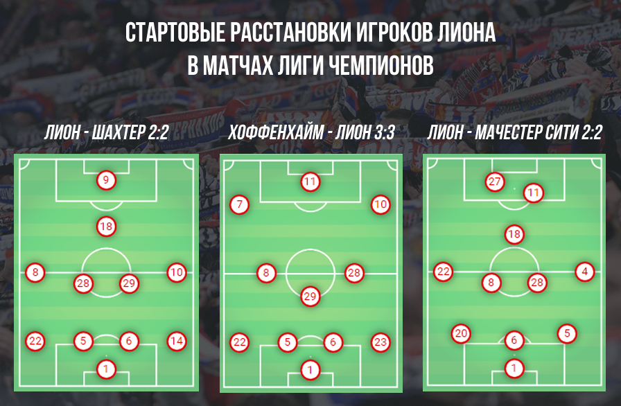 Женезьо в нынешнем розыгрыше Лиги чемпионов лишь дважды повторял стартовую тактическую расстановку своих игроков, выйдя со схемой 4-4-1-1 на первые два поединка группового раунда против «Манчестер Сити» в Англии и «Шахтера» на своем поле. С «Хоффенхаймом» на выезде «Лион» сыграл по схеме 4-3-3, а дома применил более аккуратную 5-3-2. На игру пятого тура против «Сити» дома Женезьо и вовсе решил выпустить тех же трех центрбеков, как и в предыдущем поединке против «Хоффенхайма», а вот фулбеков выдвинул значительно выше, из-за чего схему «ткачей» можно охарактеризовать не как 5-3-2, а как 3-4-1-2.