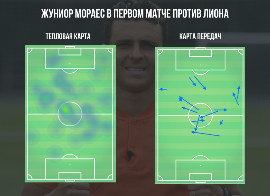 В Лионе Мораес очень часто отходил в центр поля, где активно помогал своим полузащитникам в созидании. Всего в том поединке на счету Жуниора оказалось 14 передач, причем все были точными. Но большая часть пасов Мораеса была сделана им в центральной оси поля, куда частенько за форвардом «горняков» оттягивались и защитники «Лиона». Причем Марсело и Денайер по очереди накрывали Мораеса, играя против него не персонально, а зонально.