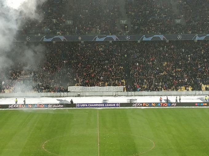 Перед началом поединка заключительного тура группового раунда Лиги чемпионов «Шахтер» – «Лион» на одной из центральных трибун НСК «Олимпийский» появился баннер «Шахтар, вам тут не раді». Также из 31-го сектора на поле был брошен файер.