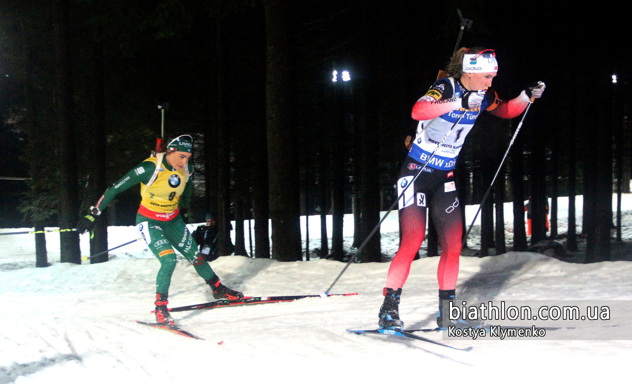 Вита Семеренко после старта с седьмого места опустилась на 31-ю позицию на финише персьюта. Как и Вите, три круга штрафа пришлось пробежать Анастасии Меркушиной, но 23-летняя тернопольчанка намного меньше времени проводила на рубежах и финишировала 22-й. Юлия Джима допустила пять промахов и не смогла попасть в очковую зону. Хуже всего выступила Елена Пидгрушная: семь кругов штрафа вынудили капитана сняться после третьей стрельбы. Отметим, что Пидгрушная не финишировала во втором персьюте подряд. Ранее 31-летняя биатлонистка сошла с дистанции в Хохфильцене.