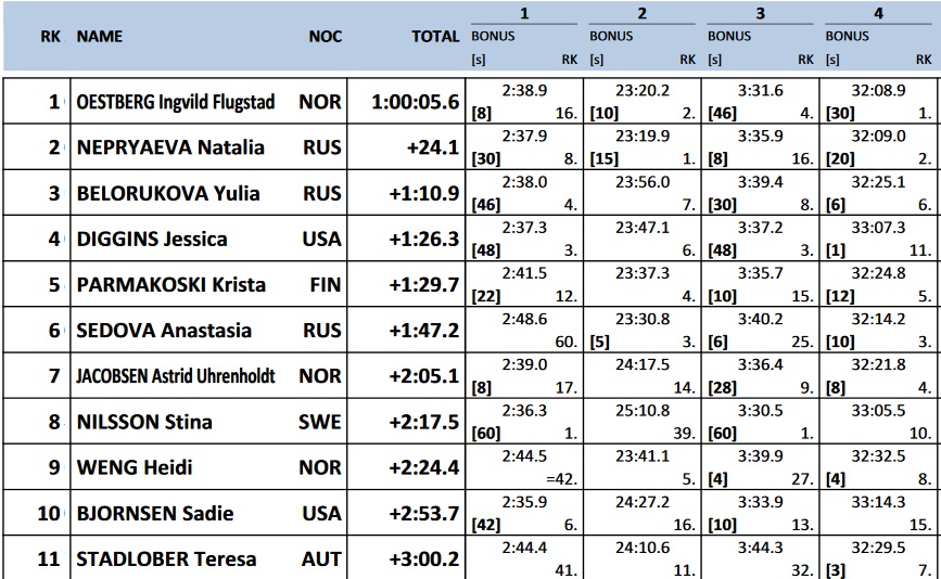 Победа Остберг, учетом неудачи Джессики Диггинс (американка финишировала только 11-й) позволила норвежке выйти в лидеры общего зачета: