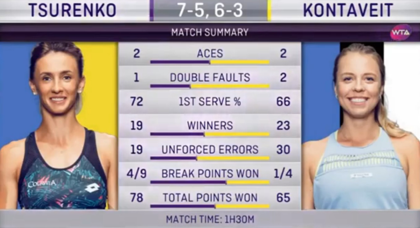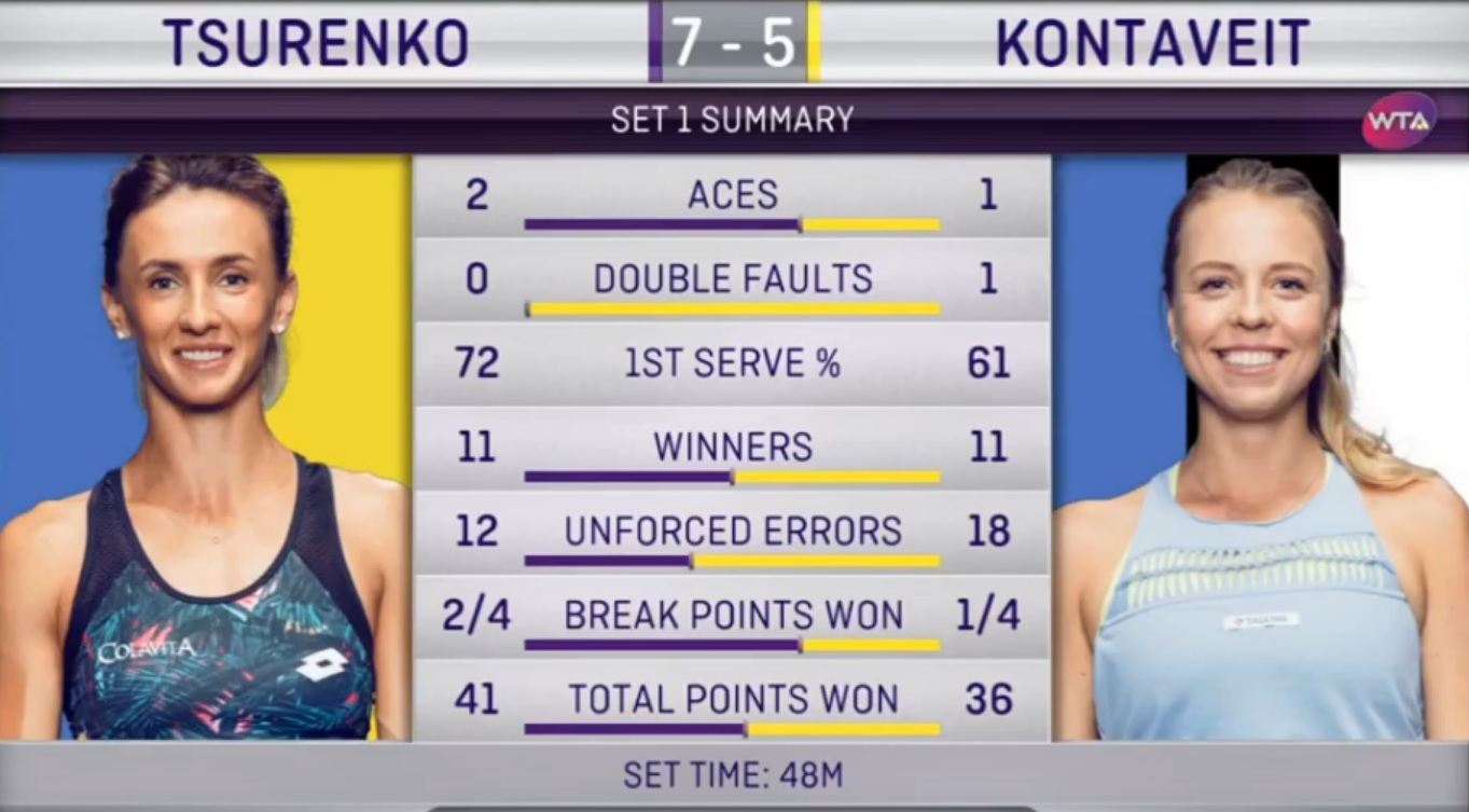 Со счета 2:0 во втором сете играть было проще, но ответственность немного давила. Контавейт сумела прийти в себя через пару геймов и отстояла тяжелейший пятый гейм, который при проигрыше окончательно бы похоронил ее шансы. К чести Цуренко, она ни на минуту не потеряла концентрацию и сделала все для победы.