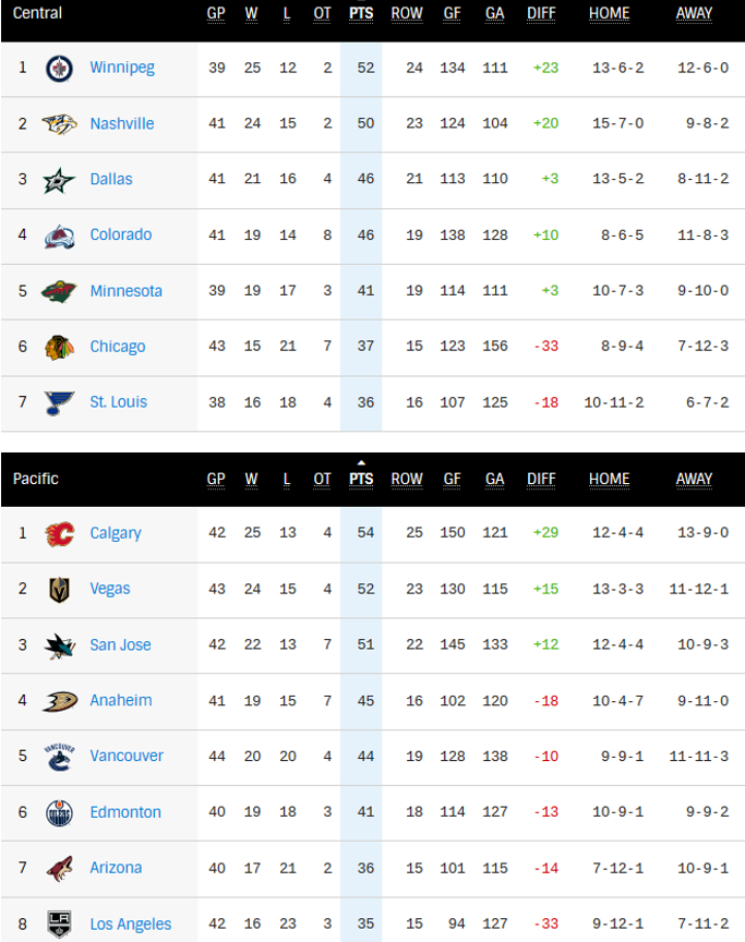 Лидером общей таблицы Лиги остается Тампа-Бэй, которая на выезде уверенно разобралась с Лос-Анджелесос 6:2. Никита Кучеров забил гол и сделал 3 ассиста, а у Стивена Стэмкоса 1+2. Сама Тампа продлила серию матчей с набранными очками до 16-ти, что позволяет ей уверенно занимать первое место в чемпионате. Ближайший соперник отстает уже на 12 очков. Этим соперником является конкурент по Атлантическому дивизиону Торонто, который сегодня уступил Миннесоте 3:4.