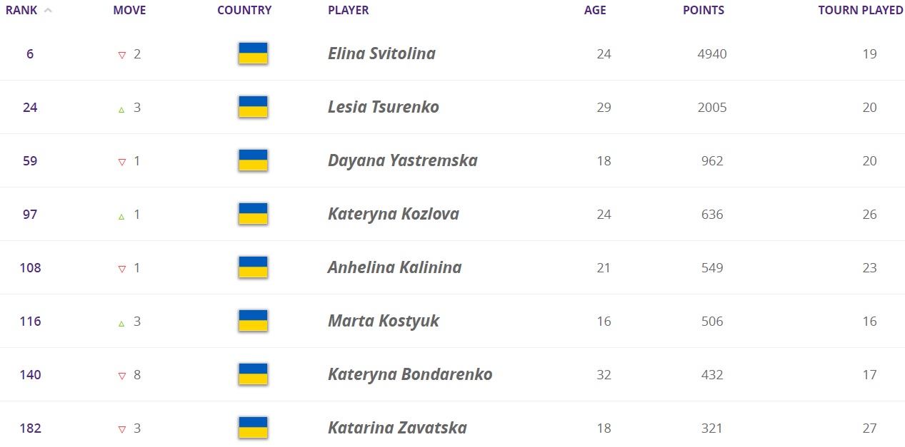 Места всех украинок в рейтинге WTA выглядят следующим образом: