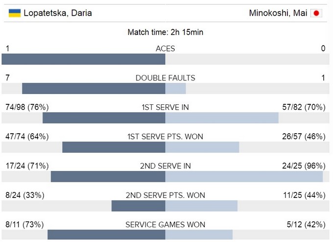 Для победы над Минокоси Лопатецкой понадобилось три сета: 3/6, 6/1, 6/1. Поединок длился 2 часа 15 минут.