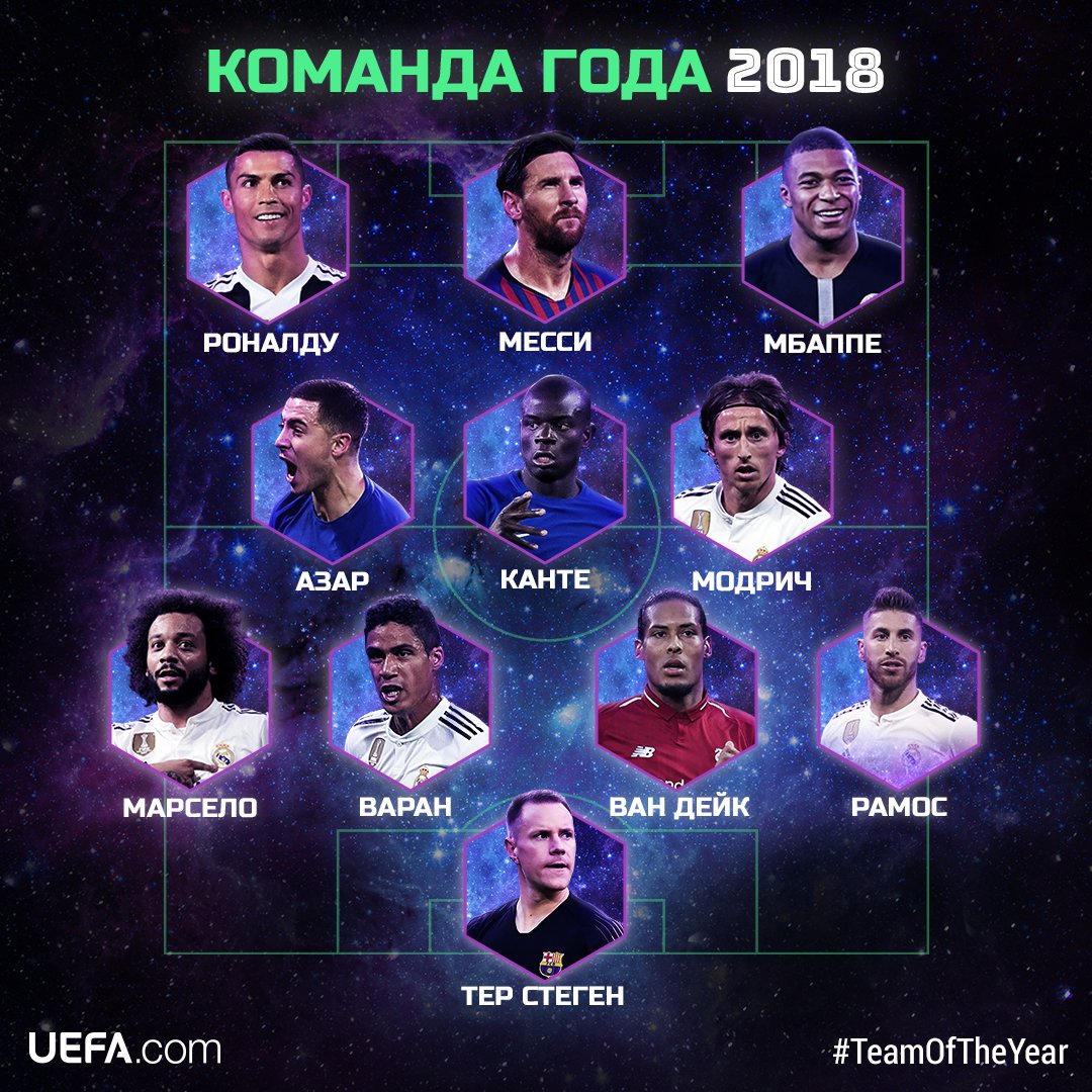УЕФА назвал сборную 2018 года по версии пользователей сайта uefa.com. В нее вошли 4 игрока «Реала», по два из «Барселоны» и «Челси», а также по одному из «Ливерпуля», «Ювентуса» (Роналду первую половину календарного года отыграл в «Реале») и ПСЖ.