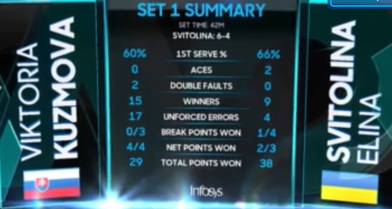 Начиналось все с легких защит своей подачи для Свитолиной и борьбы на приеме. Первый и очень вероятный шанс появился только в шестом гейме, когда Элина заработала тройной брейкпоинт. Но словачка не пала духом, дважды подала мощные первые подачи и таки забрала очко себе. При счете 4:4 на подаче Свитолиной развернулась настоящая битва, которая в результате и предопределила исход первого сета, а, возможно, и всего поединка. Элина отыграла поочередно три скрытых сетбола, хорошенько погоняв соперницу по корту, и Кужмова на своей следующей подаче все-таки не выстояла. Уровень тенниса от обеих теннисисток в первом сете приятно порадовал.